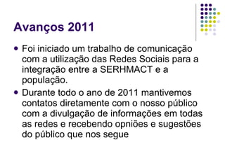 O documento discute os avanços da SERHMACT em comunicação em rede em 2011, incluindo o uso de redes sociais para se conectar com o público e divulgar eventos e informações, resultando em maior visibilidade e adesão.