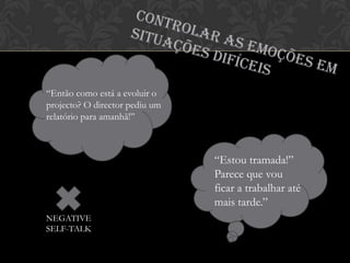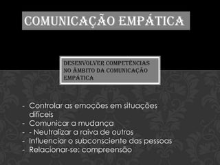 Este documento discute técnicas de comunicação empática, incluindo: (1) controlar as emoções em situações difíceis através do autocontrole e perspectivas alternativas; (2) comunicar mudanças respondendo às perguntas "o quê", "por que" e "como"; (3) neutralizar a raiva dos outros reconhecendo seus comportamentos e mantendo um pensamento positivo.