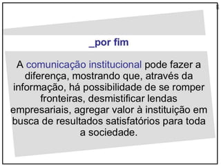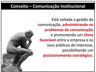 A estratégia de comunicação está voltada para gerenciar a comunicação entre a empresa e seus públicos de interesse, administrando problemas e promovendo um clima favorável, possibilitando um posicionamento estratégico. Ela engloba conceitos como comunicação institucional e ferramentas como assessoria de imprensa, marketing social, cultural e esportivo, responsabilidade social, jornalismo empresarial e balanço social, identidade e imagem corporativa, publicidade institucional e editoração multimídia e relações públicas.
