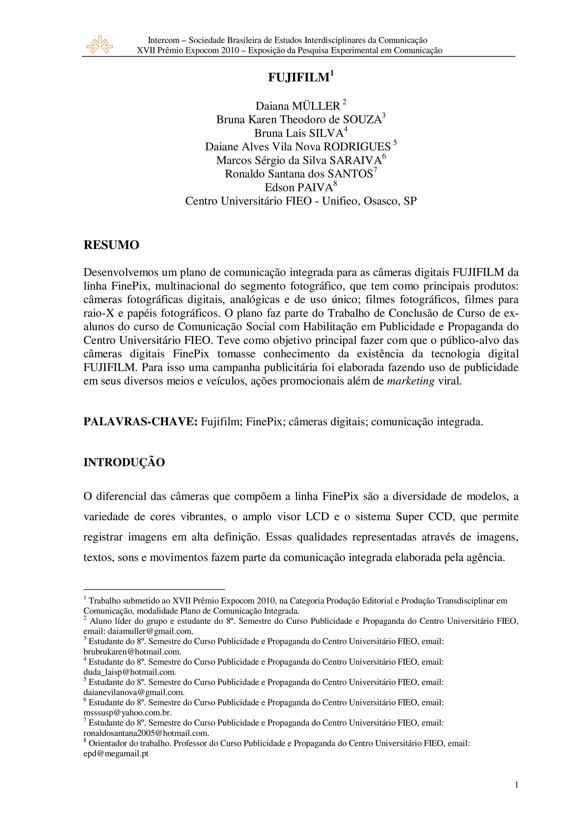 O documento apresenta um plano de comunicação integrada para promover as câmeras digitais Fujifilm da linha Finepix, realizado por alunos do curso de Publicidade e Propaganda do Centro Universitário FIEO. A campanha visa aumentar a conscientização do público sobre a tecnologia das câmeras e ampliar a participação de mercado da empresa. Diversas ações promocionais, incluindo publicidade em mídias variadas e marketing viral, foram propostas para destacar os diferenciais dos produtos, como a qualidade de imagem e a variedade de cores.