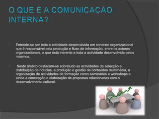 O documento discute as funções e atividades de comunicação e relações públicas dentro de uma organização. Ele explica que a comunicação interna é essencial para manter a moral dos funcionários alta e motivar o pessoal. Também descreve as principais tarefas de um departamento de relações públicas, como pesquisa de opinião, planejamento de comunicação, coordenação de informações e produção de materiais promocionais.