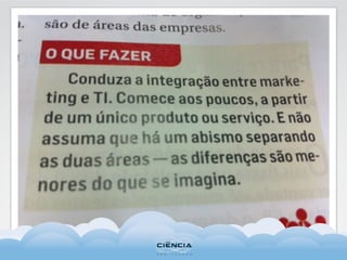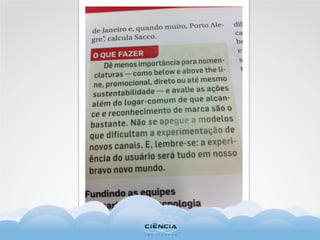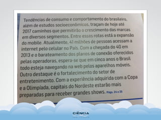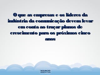 O documento discute as tendências da indústria de comunicação para os próximos cinco anos no Brasil, incluindo o crescimento do uso de smartphones e redes 4G, a ênfase na experiência do consumidor, e a necessidade de integração entre equipes de marketing e tecnologia.