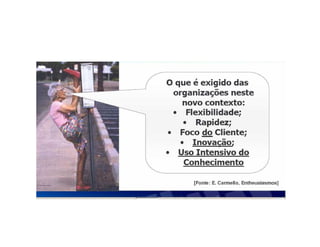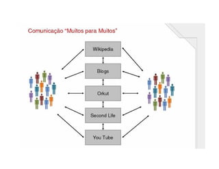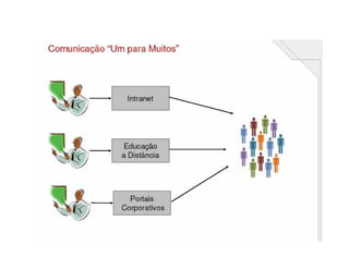 O documento resume a evolução da comunicação desde sinais até a internet, destacando marcos como o telégrafo, rádio, TV e computador. Também discute como a gestão do conhecimento pode promover o desempenho organizacional através da criação e circulação de conhecimento, e como as novas tecnologias permitem a aprendizagem e interação sem fronteiras de espaço e tempo.