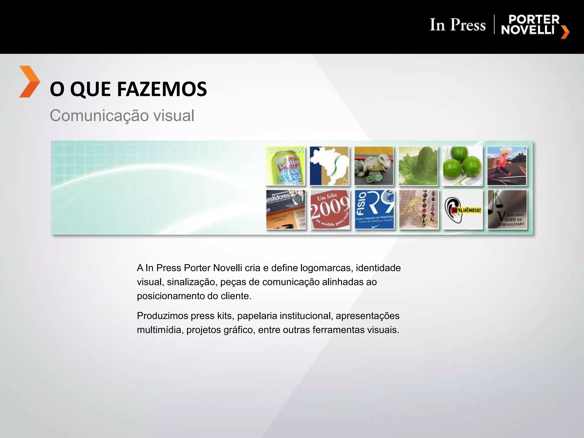 O documento descreve vários casos de comunicação visual e marketing realizados pela agência In Press Porter Novelli, incluindo o desenvolvimento de identidades visuais, kits de imprensa conceituais e peças para eventos de lançamento de produtos e programas.