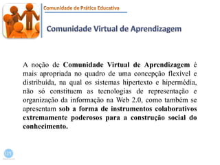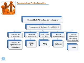 O documento explora as potencialidades das ferramentas da Web 2.0, como Slideshare, Google Docs, Ning, Delicious e Zotero, no contexto das comunidades virtuais de aprendizagem. Essas ferramentas favorecem a comunicação, colaboração e socialização entre os participantes, ampliando as oportunidades de aprendizagem. Além disso, o texto ressalta a importância de considerar as limitações dessas ferramentas para o funcionamento eficaz das comunidades virtuais.