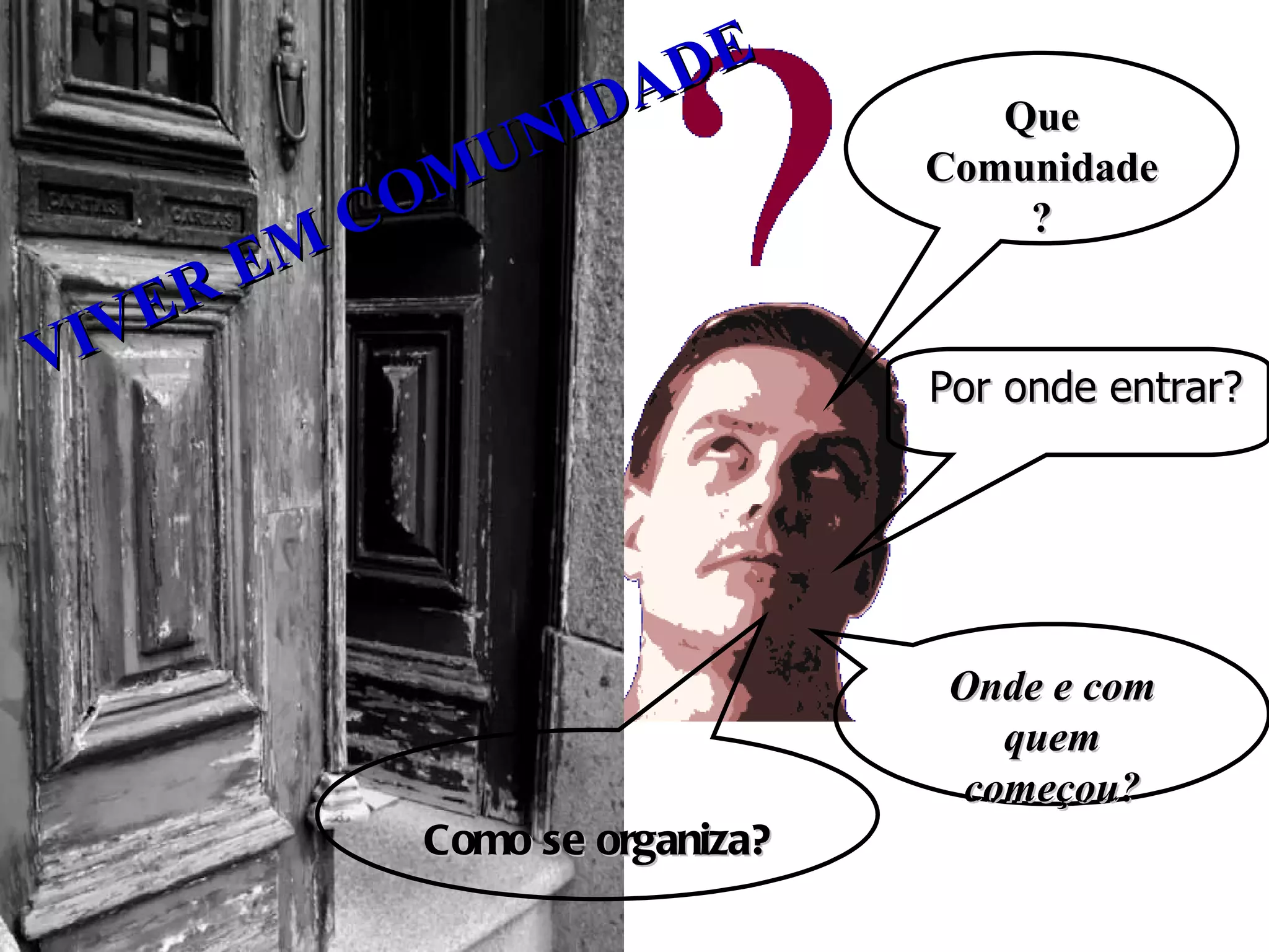 O documento descreve a origem e organização da comunidade cristã, começando com Jesus reunindo seus discípulos e instruindo-os a servir uns aos outros. Fala sobre como a comunidade cresceu após a ressurreição de Jesus, liderada pelos apóstolos Pedro e Paulo. Explica a estrutura da Igreja Católica hoje em dia, com o Papa liderando a Igreja Universal, bispos liderando dioceses, e padres liderando paróquias e comunidades locais.