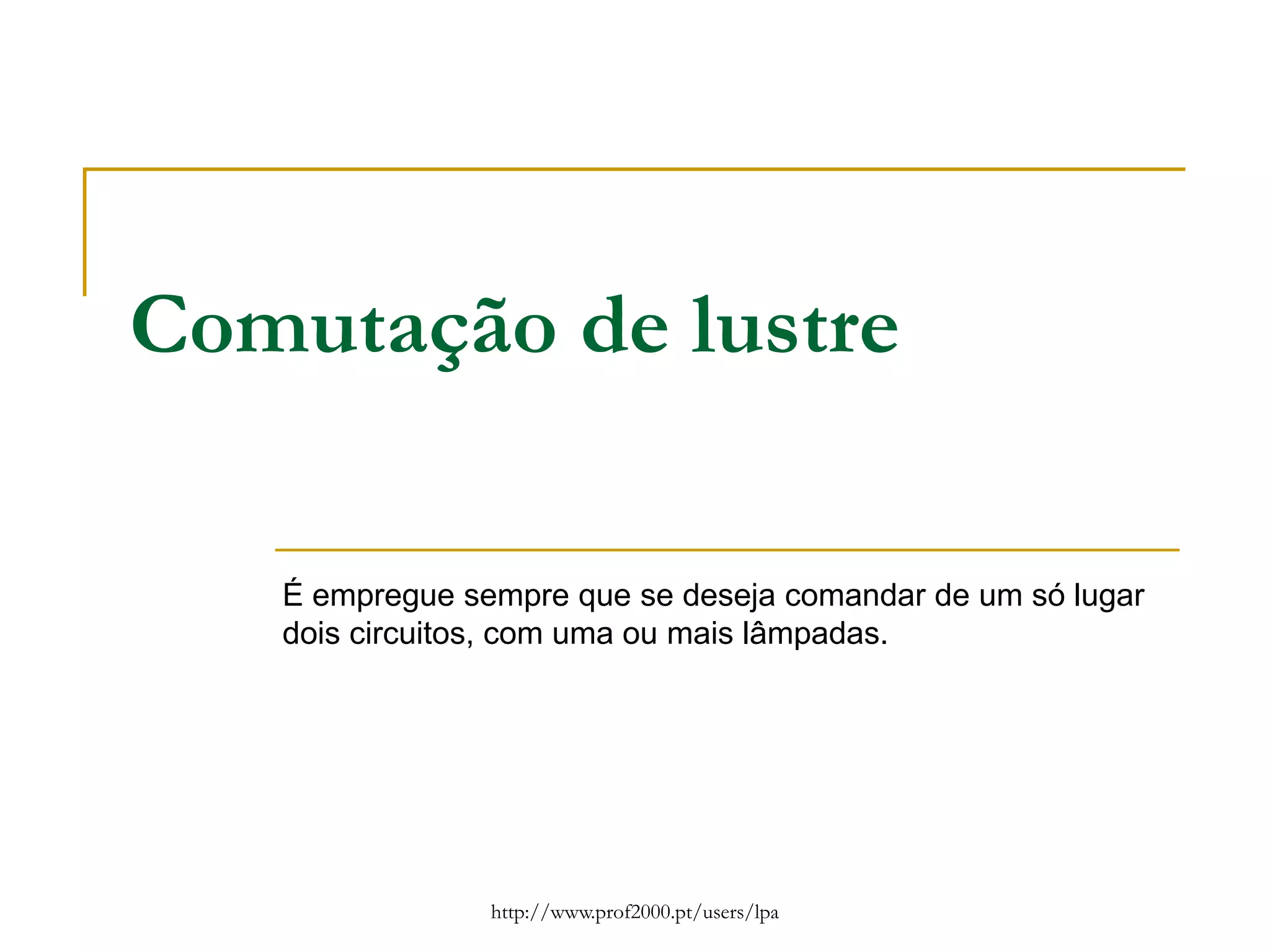 O documento discute diferentes tipos de esquemas elétricos para instalações de iluminação, incluindo esquemas funcionais, unifilares, multifilares e arquiteturais. Explica que esquemas funcionais mostram o funcionamento e ligações principais sem cruzamentos de linhas, enquanto esquemas unifilares dão indicações sobre o percurso da instalação e localização de elementos. Esquemas arquiteturais traçam canalizações e localização de caixas, aparelhos e outros itens em plantas.