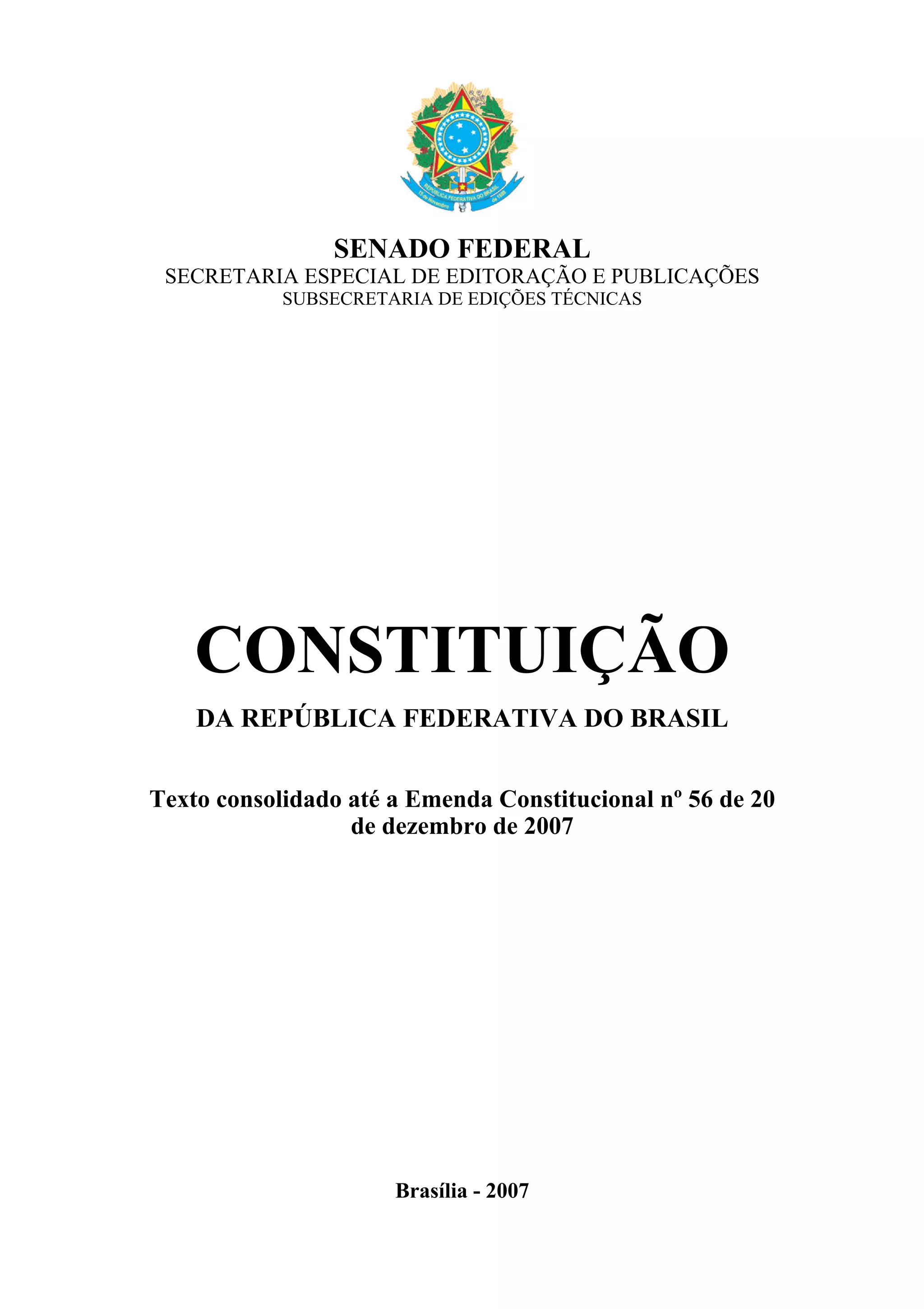 Este documento é a Constituição da República Federativa do Brasil, consolidada até 2007 com 56 emendas. A Constituição contém títulos que definem os princípios fundamentais, direitos e garantias, a organização do Estado brasileiro e a organização dos poderes.