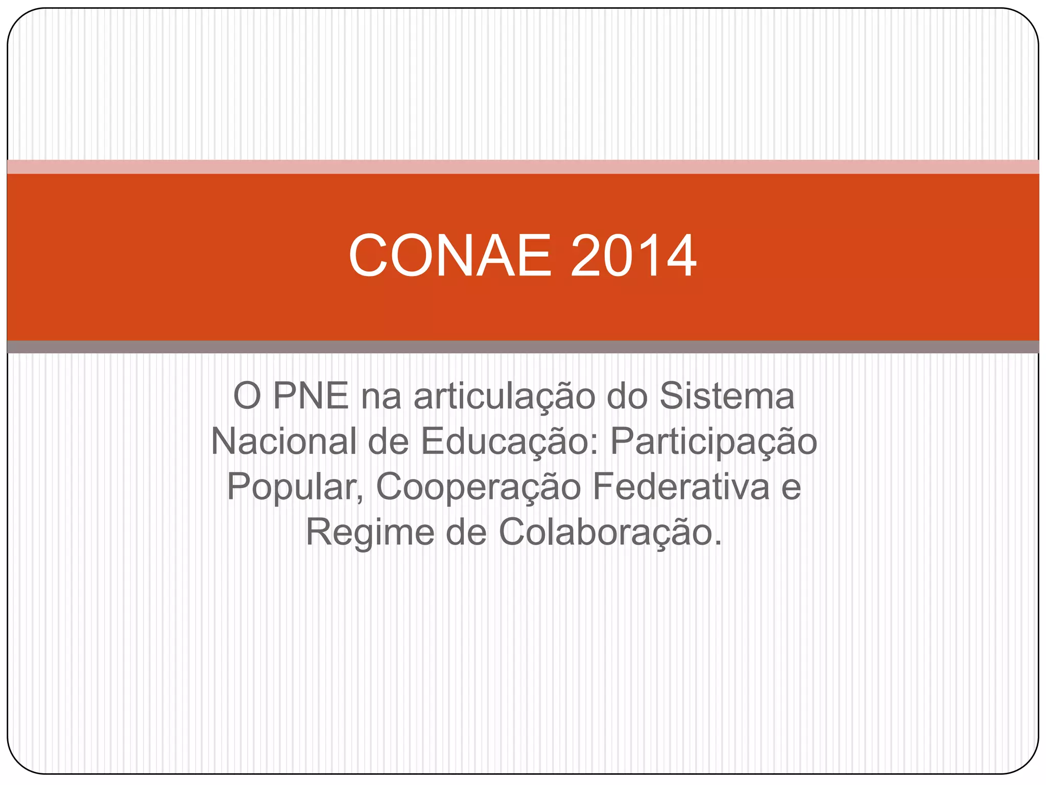 O documento descreve o Plano Nacional de Educação (PNE) para o período de 2011 a 2020 no Brasil, estabelecendo 20 metas educacionais nacionais para serem alcançadas, como universalizar a educação infantil e o ensino fundamental, melhorar os índices do IDEB, ampliar a oferta de educação superior e pós-graduação, valorizar os professores e ampliar os investimentos em educação.
