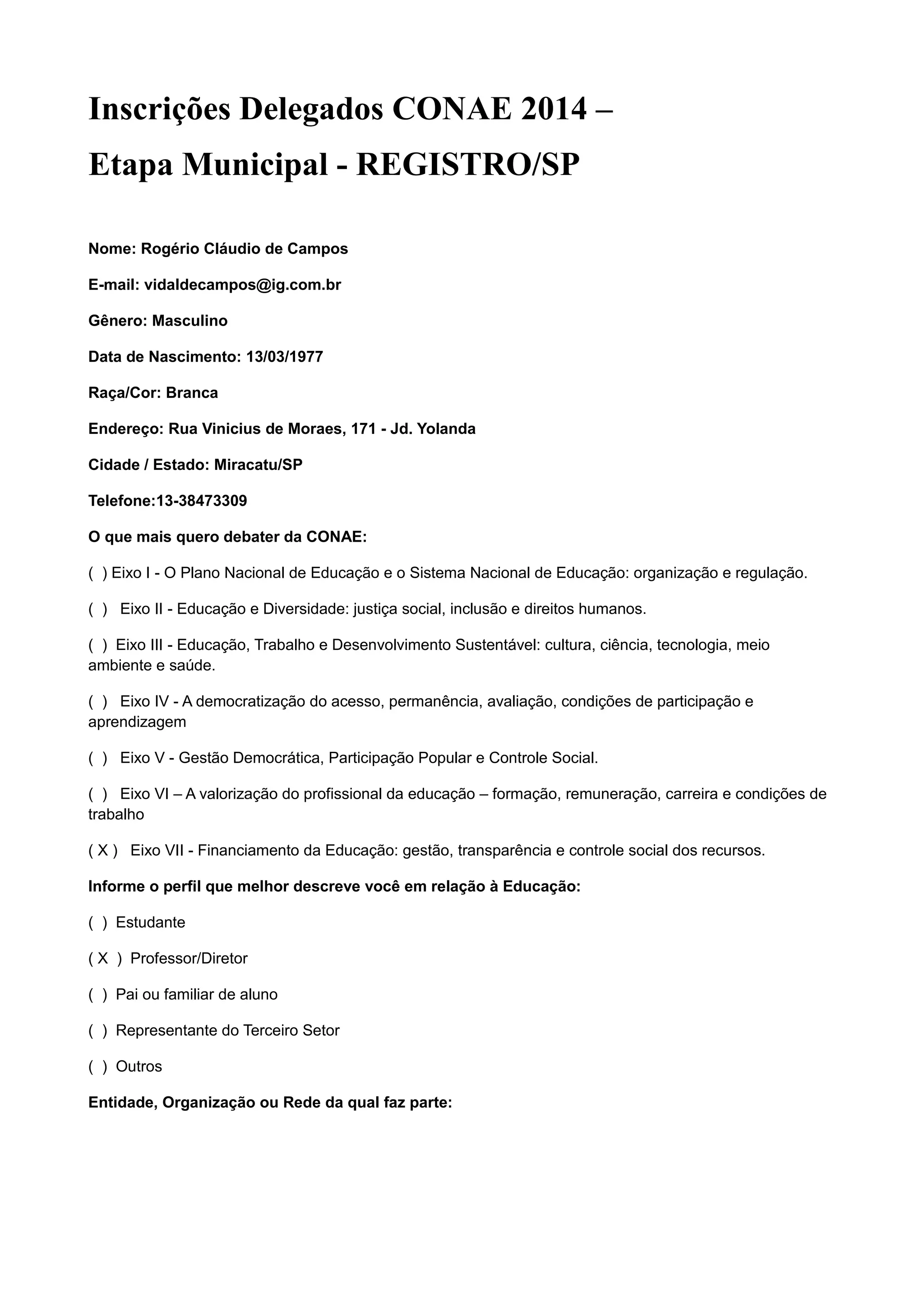 Rogério Cláudio de Campos, professor de Miracatu/SP, se inscreveu como delegado na CONAE para debater principalmente o Eixo VII - Financiamento da Educação. Ele se identifica como professor e não faz parte de nenhuma entidade ou organização.