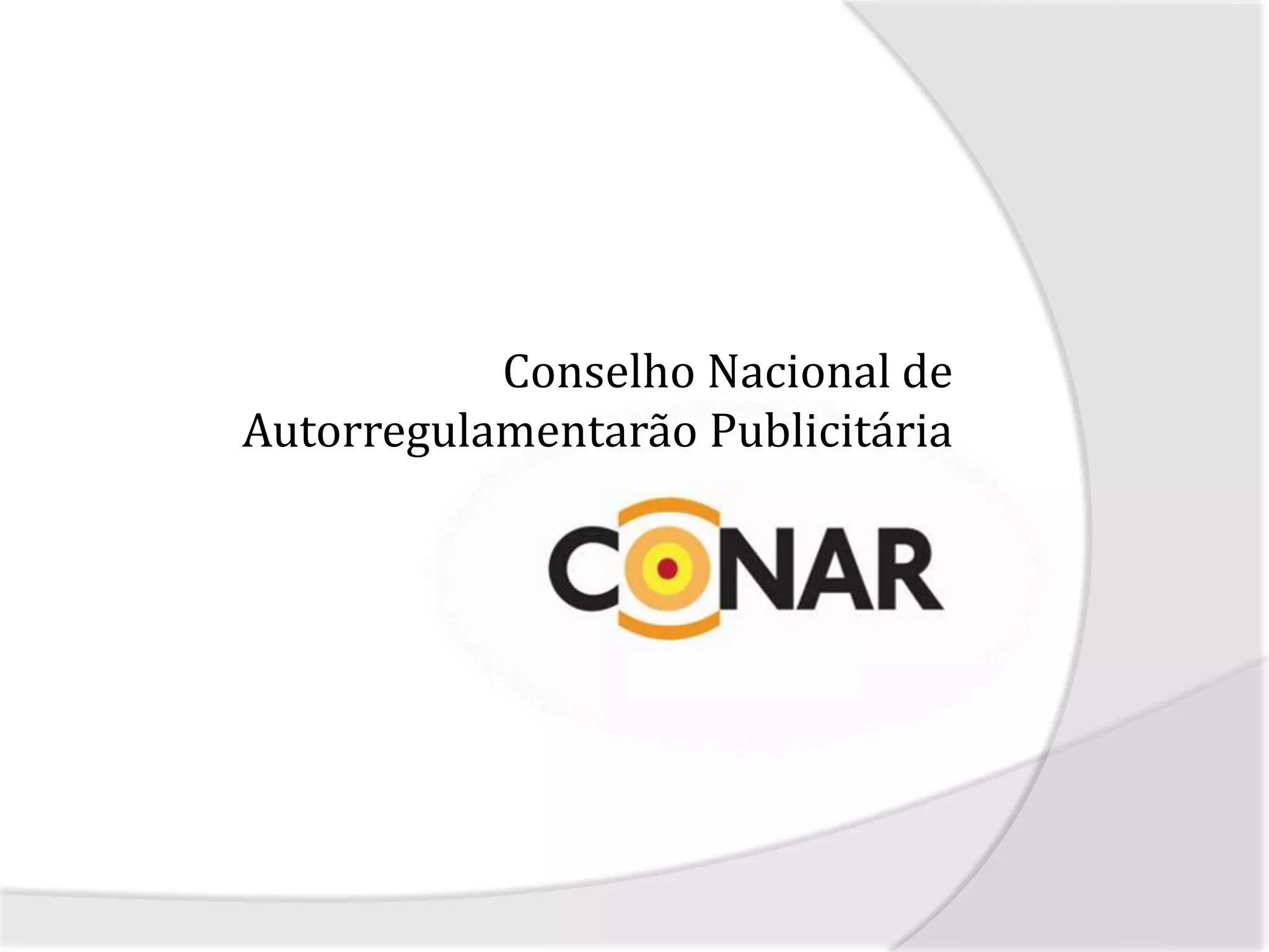O documento resume a história e função do Conselho Nacional de Autorregulamentação Publicitária (CONAR) no Brasil. O CONAR surgiu nos anos 1970 para estabelecer um código de ética e autorregular a publicidade em vez de censura governamental. Desde então, o CONAR julgou milhares de processos éticos relacionados a anúncios publicitários.