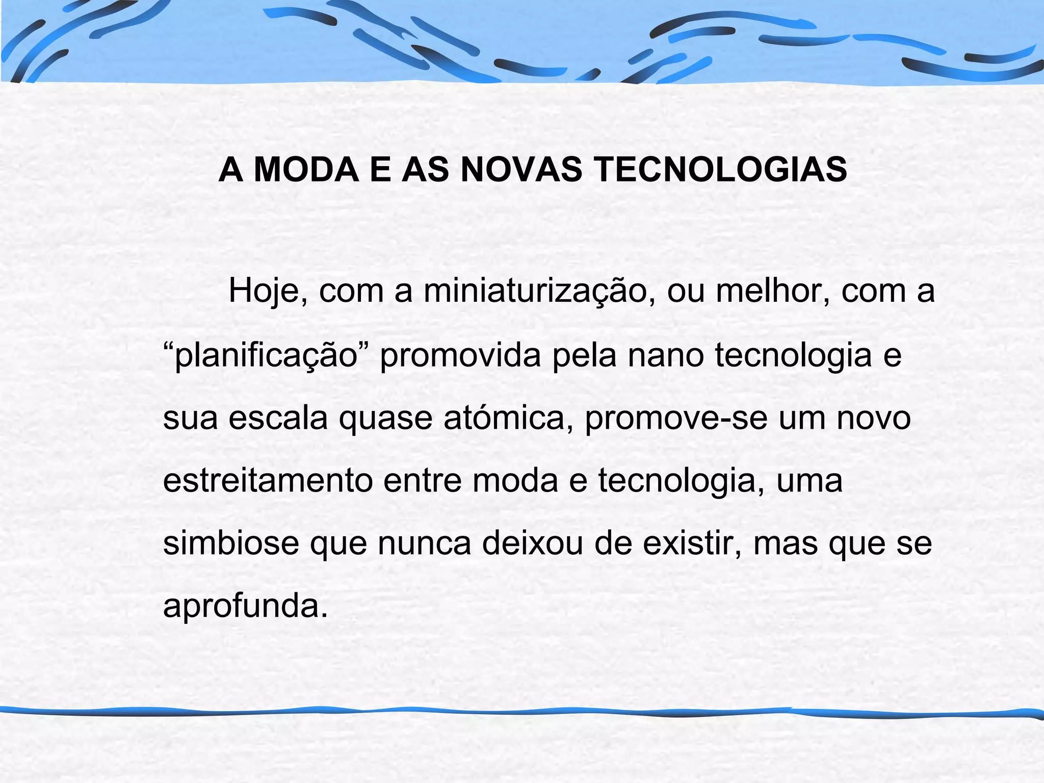 O documento discute como a moda e as novas tecnologias estão se tornando mais integradas, com roupas que possuem funcionalidades como telefonia celular e monitoramento de saúde. Também aborda como as redes sociais estão sendo usadas pela indústria da moda para divulgar criações e coleções de forma barata e eficiente.