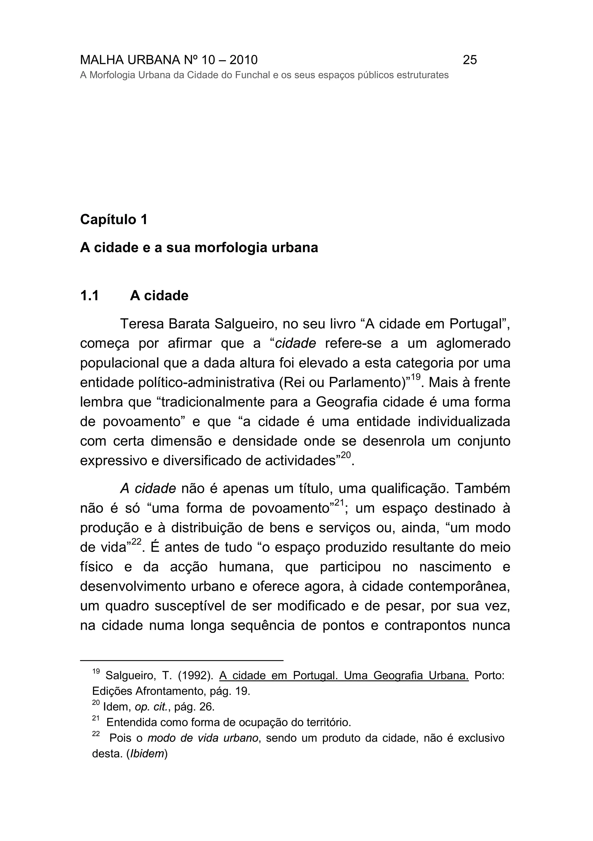 Este documento discute a morfologia urbana da cidade e seus espaços públicos estruturantes. Primeiramente, define o que é uma cidade e sua morfologia urbana, enfatizando que a cidade é o resultado das características do lugar e das decisões humanas ao longo do tempo. Em seguida, explica que a morfologia urbana estuda a evolução das formas urbanas tendo em conta o desenvolvimento urbano e a reutilização das partes da cidade. Por fim, discute a análise da forma urbana, enfatizando