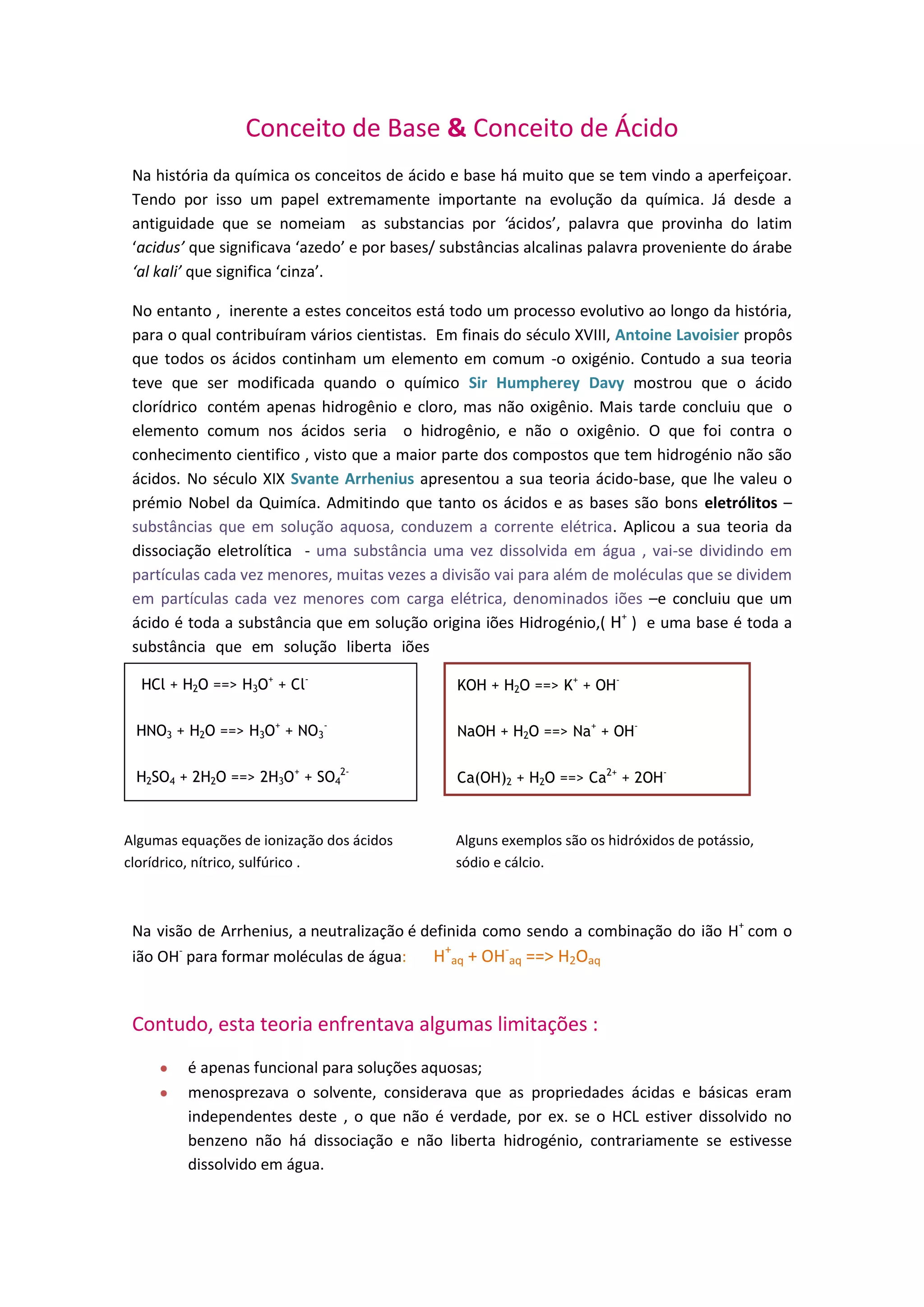 O documento descreve a evolução histórica da compreensão dos conceitos de ácido e base, desde a antiguidade até teorias modernas. Inicialmente, ácidos eram considerados substâncias "azedas" e bases substâncias alcalinas, mas conceitos foram sendo aperfeiçoados. A teoria de Arrhenius definiu ácidos como produtores de íons hidrogênio e bases de íons hidróxido, mas tinha limitações. A teoria de Brønsted-Lowry definiu ácidos e bases em termos de doação e
