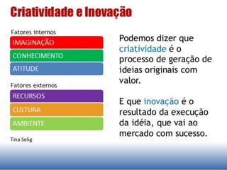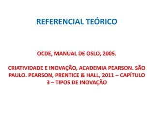 O documento discute o conceito de inovação e seus tipos segundo referenciais como o Manual de Oslo e a OCDE. Apresenta inovação como a implementação de algo novo no produto, processo, marketing ou organização e lista os cinco tipos de Schumpeter. Explica também os tipos de inovação de produto, processo, organizacional e de marketing de acordo com o Manual de Oslo.