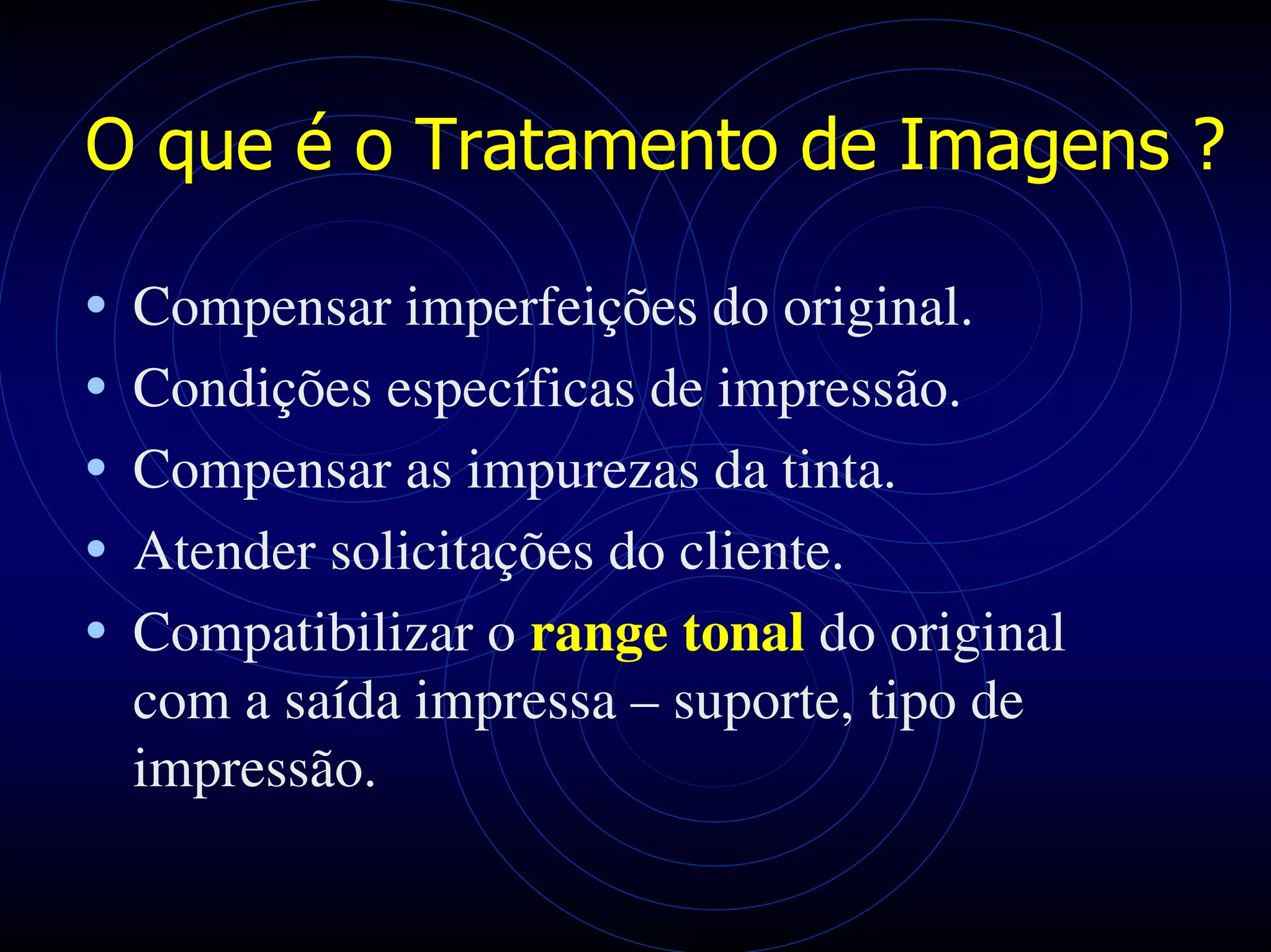 O documento discute o tratamento de imagens digitalizadas, incluindo compensar imperfeições, atender solicitações de clientes e balancear contrastes, cores e detalhes para melhorar a qualidade da imagem impressa.