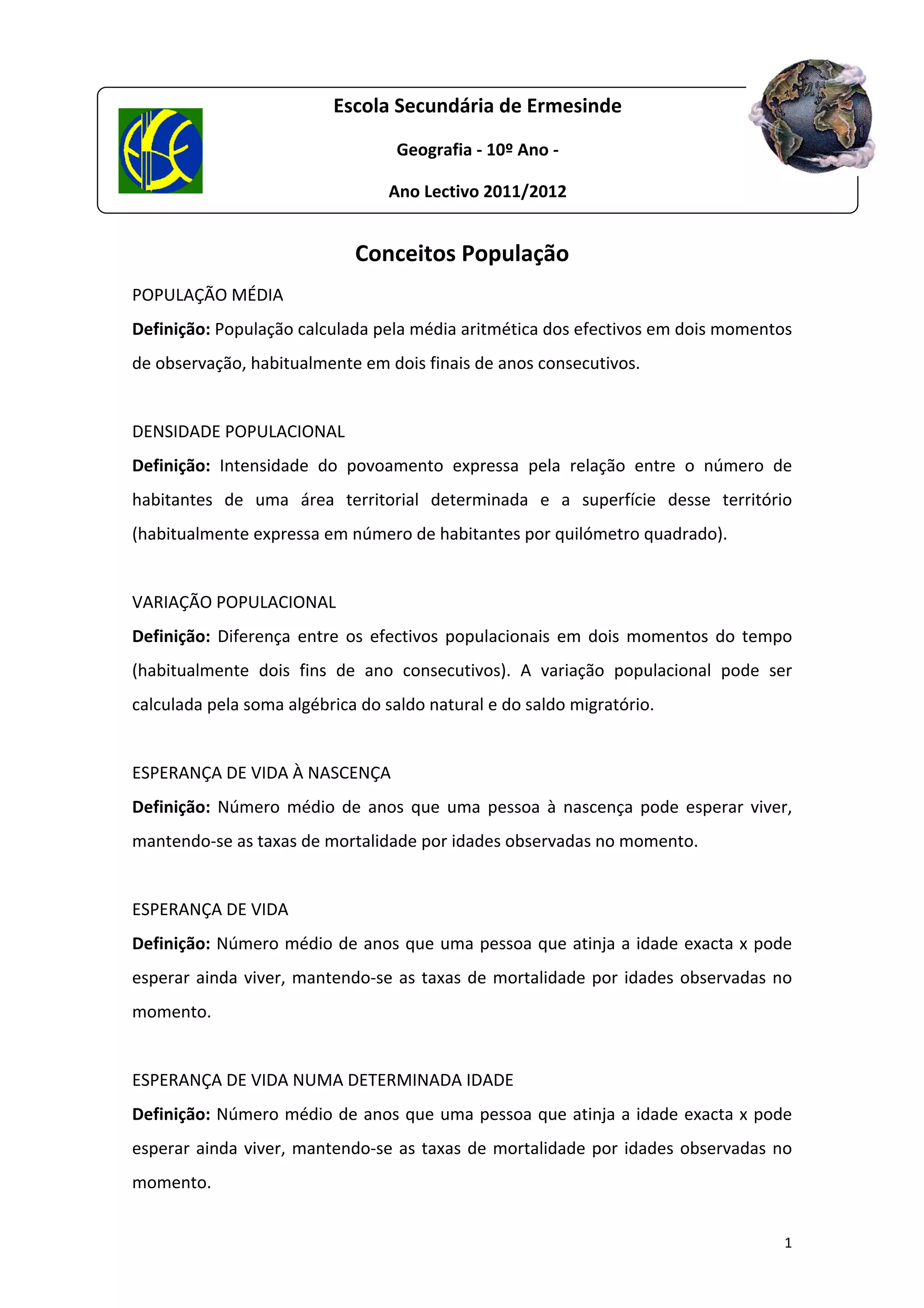 Este documento fornece definições de vários conceitos populacionais, incluindo população média, densidade populacional, variação populacional, esperança de vida, índices de dependência, migração, natalidade e mortalidade. As definições abrangem medidas demográficas-chave usadas para descrever e analisar características e mudanças nas populações humanas.