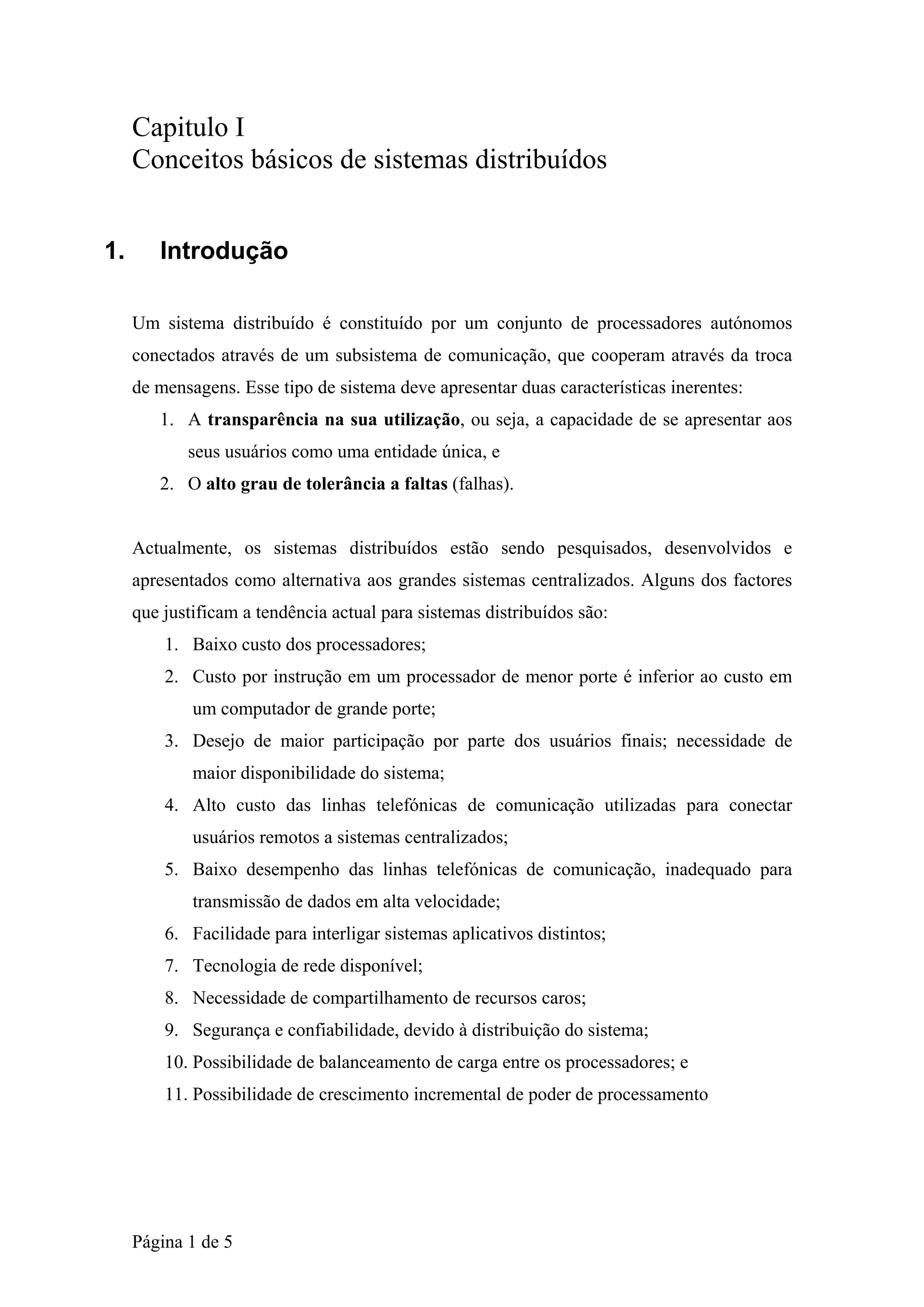 Um sistema distribuído é constituído por processadores autônomos conectados através de uma rede que cooperam trocando mensagens. Sistemas distribuídos oferecem duas vantagens principais: transparência no uso e alta tolerância a falhas. As vantagens incluem crescimento incremental, implementação de aplicações distribuídas, maior poder computacional e disponibilidade.