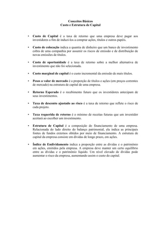 O documento define vários conceitos relacionados a custo e estrutura de capital de uma empresa, incluindo custo de capital, custo de colocação, custo de oportunidade, pesos de mercado, retorno esperado, taxa de desconto ajustada ao risco e estrutura de capital.