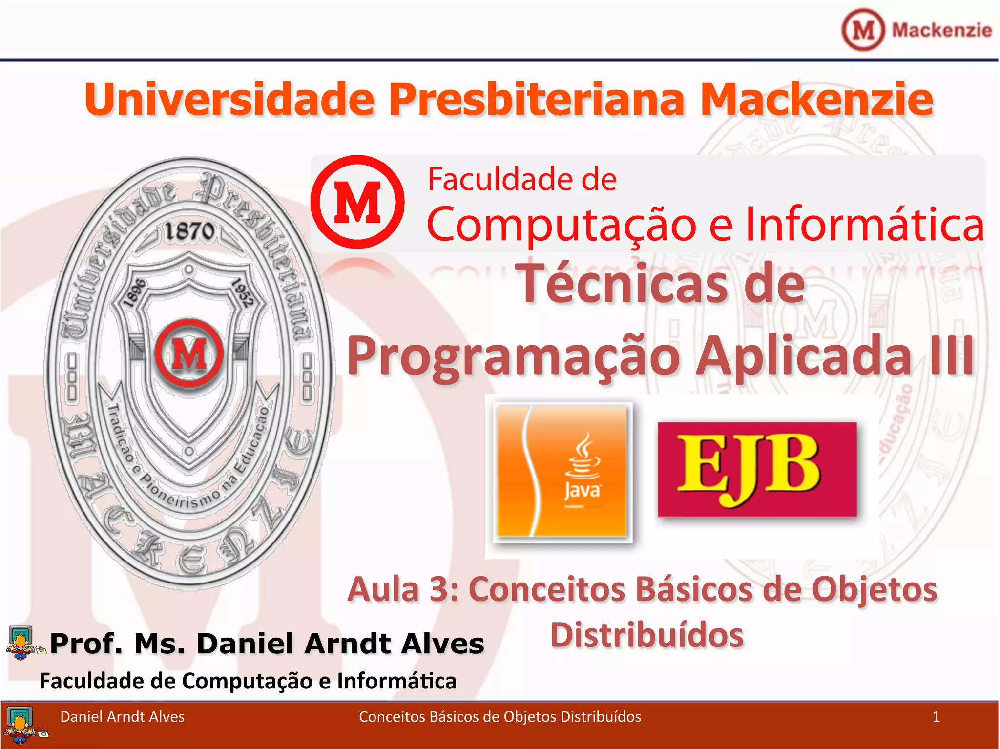 1) A aula apresenta conceitos básicos de objetos distribuídos, incluindo chamada remota de métodos e arquiteturas como RPC, CORBA e Java RMI.