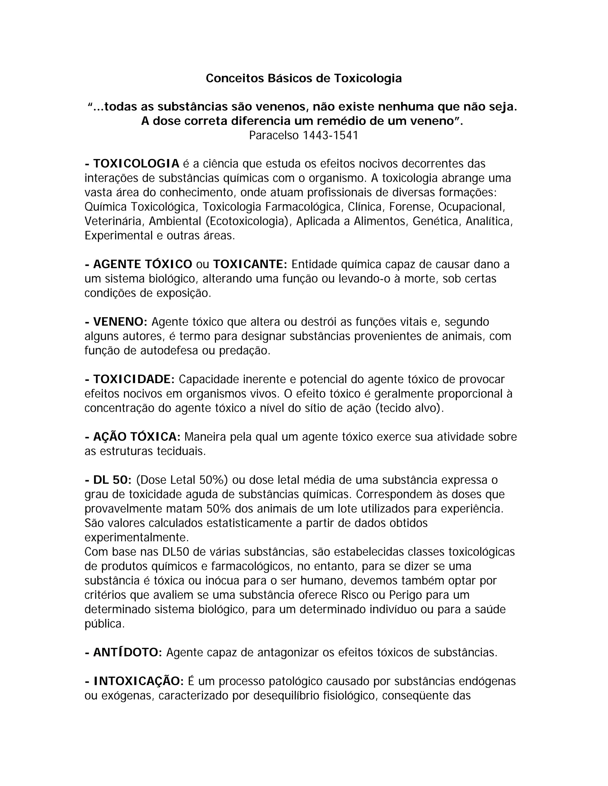 Toxicologia estuda os efeitos de substâncias químicas nos organismos. Agentes tóxicos podem causar danos ou morte dependendo da dose. A toxicidade depende da concentração do agente no local de ação e de fatores como via de exposição e propriedades químicas. Interações entre substâncias podem resultar em efeitos aditivos, sinérgicos, de potencialização ou antagonismo.