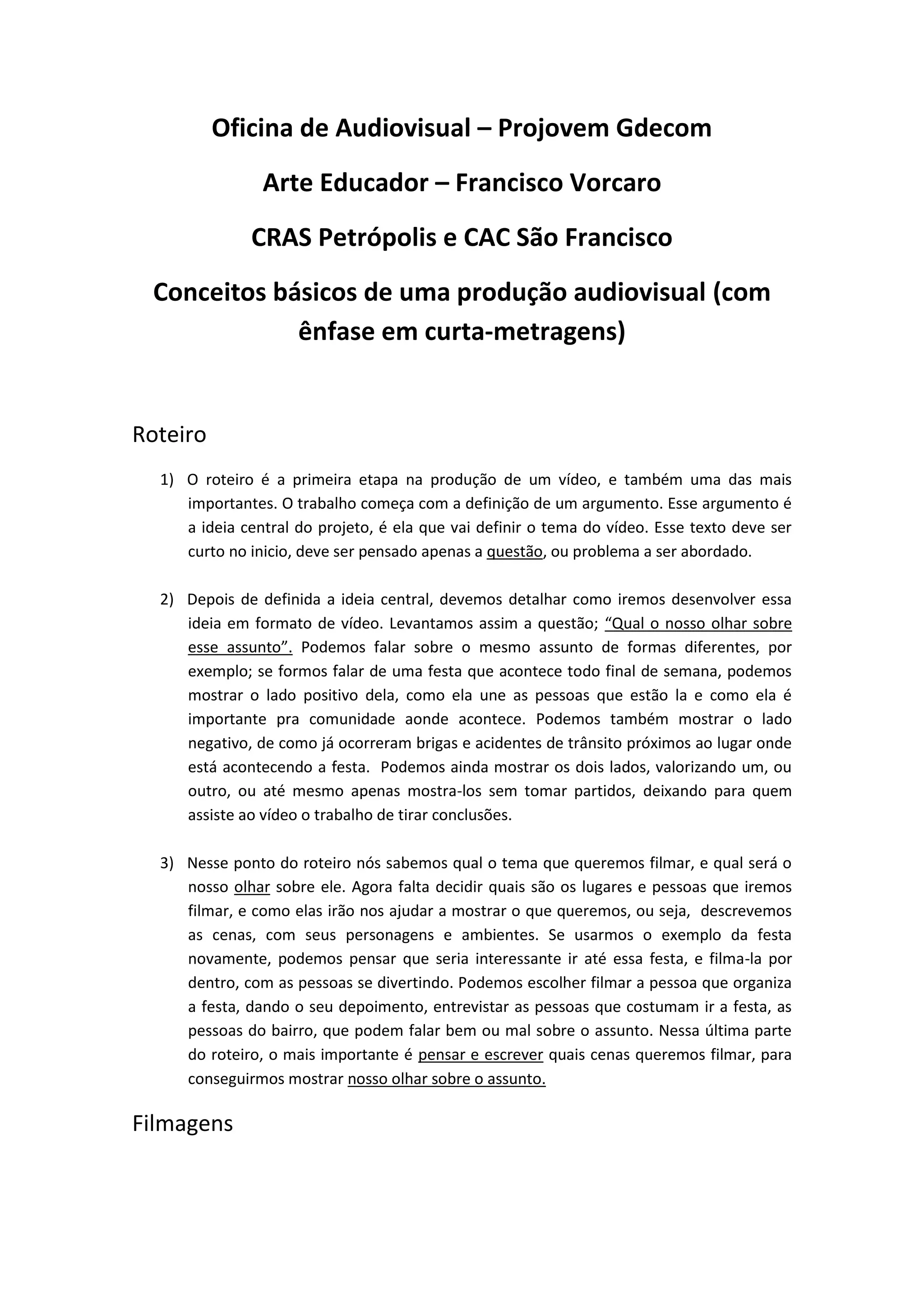 O documento fornece instruções sobre os principais conceitos de produção de um curta-metragem, incluindo roteiro, filmagens e edição. No roteiro, discute-se a definição da ideia central, o ponto de vista e as cenas e personagens. Nas filmagens, destacam-se conceitos como enquadramento, regra dos terços e tipos de planos. A edição é descrita como a organização dos trechos filmados em blocos narrativos.