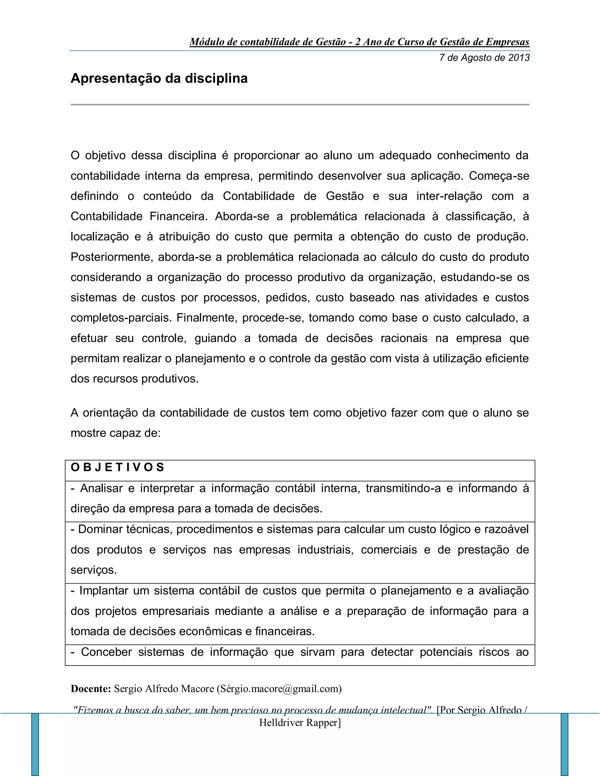 O documento apresenta o módulo de contabilidade de gestão para o segundo ano de um curso de gestão de empresas. Discute os objetivos da disciplina de contabilidade de gestão e introduz conceitos básicos como a diferença entre contabilidade financeira e contabilidade de custos, assim como a definição de custo. Também fornece um exemplo prático sobre o cálculo do resultado interno de diferentes atividades de uma empresa de turismo.