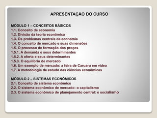 1) O documento apresenta os conceitos básicos de economia divididos em dois módulos, abordando tópicos como a definição de economia, divisão da teoria econômica, problemas centrais da economia e formação de preços.