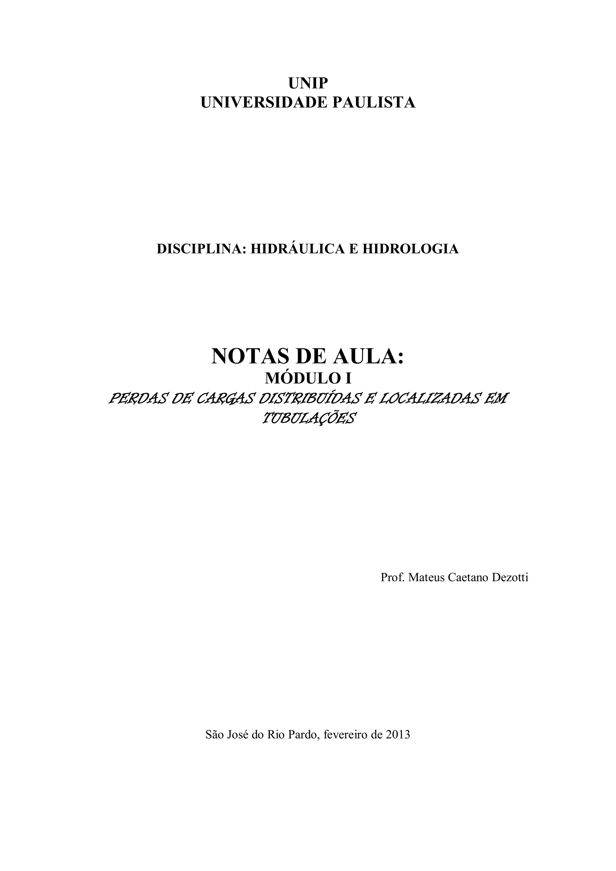 1) O documento apresenta conceitos fundamentais de hidráulica e hidrodinâmica, incluindo definições de massa específica, peso específico, pressão, metro de coluna d'água e classificação dos movimentos de fluidos.