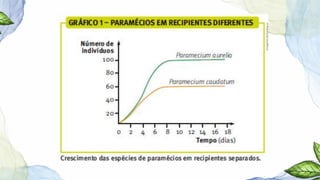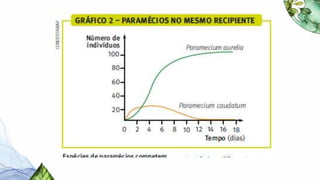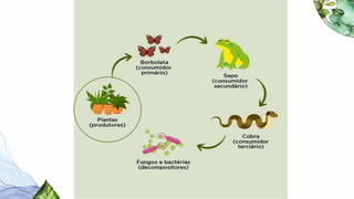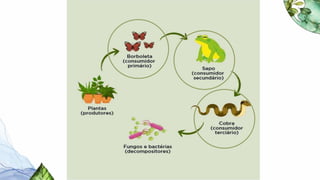 O documento discute conceitos fundamentais de ecologia, incluindo os níveis de organização estudados pela ecologia (populações, comunidades e ecossistemas), a definição de ecossistema como a unidade ecológica formada por uma parte biótica e abiótica, e as relações tróficas entre produtores, consumidores e decompositores dentro de um ecossistema.