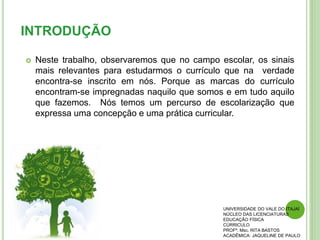 O documento aborda a construção e a importância do currículo escolar, destacando que ele reflete a prática pedagógica e a cultura da comunidade escolar. São apresentadas diferentes perspectivas sobre o currículo, incluindo seus paradigmas históricos e a necessidade de um projeto político pedagógico que valorize a diversidade cultural. A reflexão final enfatiza que a escola deve ir além da transmissão de uma única cultura, reconhecendo e valorizando as múltiplas identidades presentes no contexto educacional.