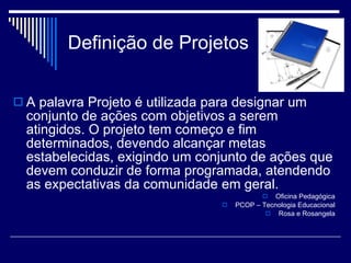 O documento define projeto como um conjunto de ações com objetivos e metas para atender as expectativas da comunidade. Descreve as fases de um projeto incluindo justificativa, objetivo, público-alvo, plano de ação, avaliação, recursos e cronograma. Também discute critérios para análise de um projeto como clareza, coerência e viabilidade.