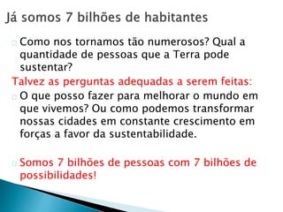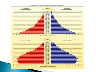 O documento discute a população mundial e brasileira, abordando tópicos como crescimento populacional, densidade demográfica, taxas de natalidade e mortalidade. Apresenta ainda as teorias de Malthus e os neomalthusianos sobre população e recursos, além de explicar a transição demográfica no Brasil e os setores de atividade econômica.