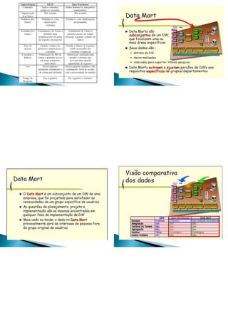 O documento discute o conceito de data warehouse, sua arquitetura e diferenças em relação ao operational data store. Apresenta as abordagens top-down e bottom-up para a construção de um data warehouse e fatores importantes para o sucesso de um projeto de data warehouse.