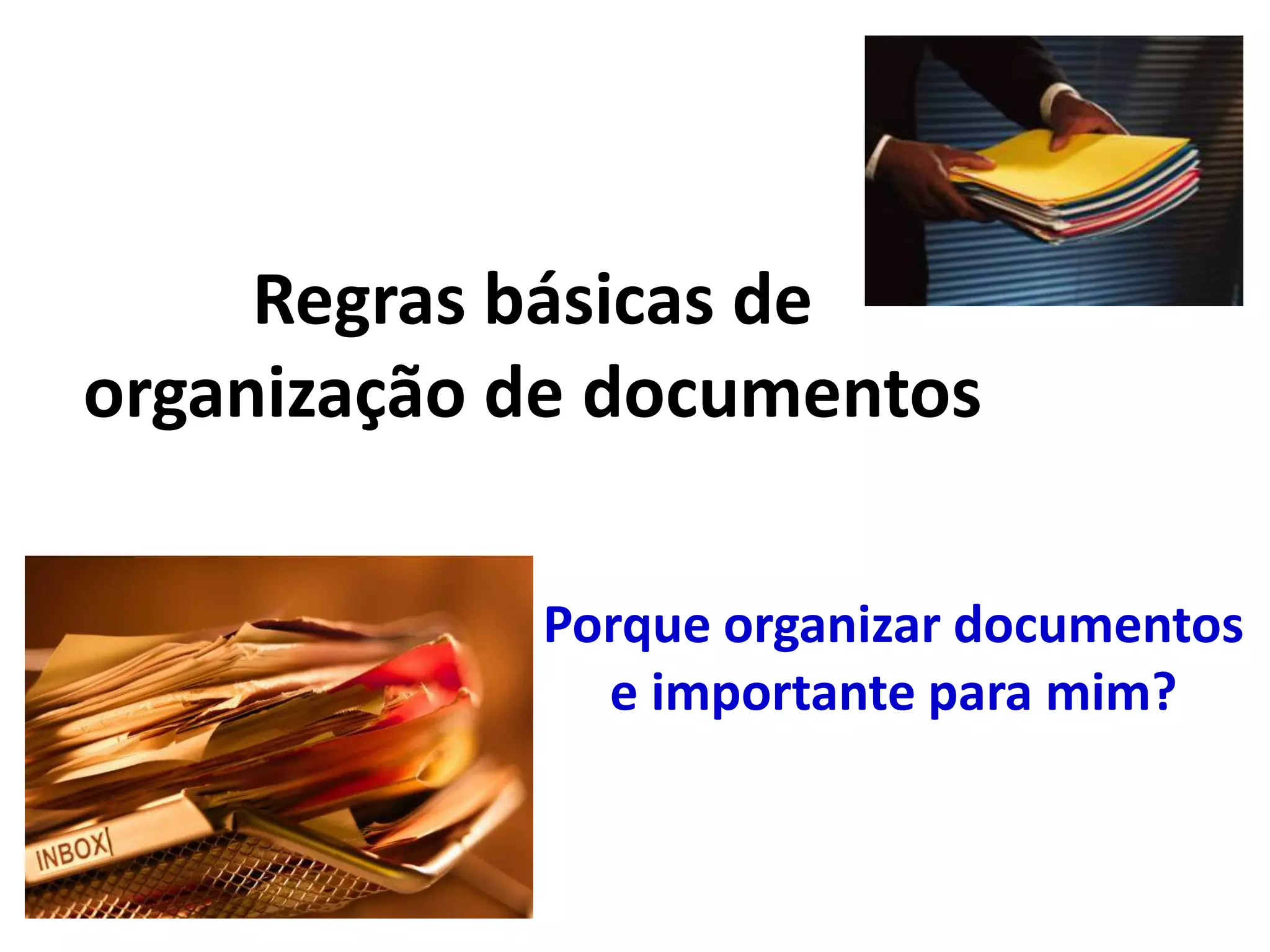 O documento descreve regras básicas para organizar documentos no trabalho e em casa, destacando a importância da organização para aumentar a produtividade e reduzir o tempo de acesso à informação. Exemplos de organização incluem classificar e-mails, contratos e contas, além de usar nomes padronizados para arquivos. Implementar sistemas de gerenciamento de documentos também é sugerido como uma forma de otimizar o controle e a acessibilidade.