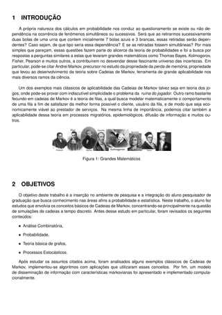 1) O documento discute conceitos e simulação de cadeias de Markov, incluindo passeios aleatórios. 2) Ele apresenta objetivos de estudar cadeias de Markov discretas no tempo e simular modelos de disseminação de informação. 3) Inclui exemplos e equações para calcular probabilidades de transição entre estados usando potências da matriz estocástica.
