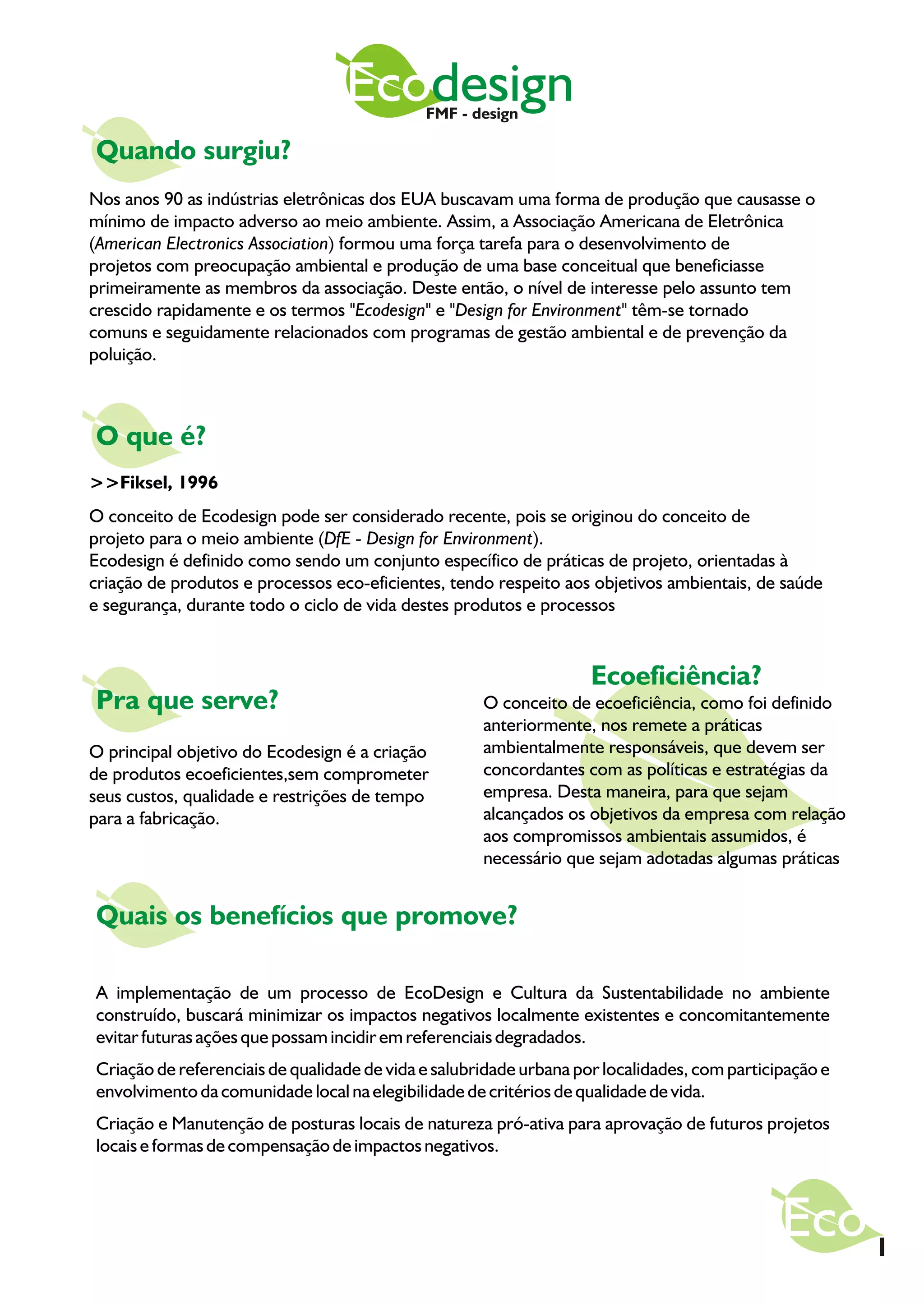 O documento discute o conceito de Ecodesign, que surgiu na década de 1990 como uma abordagem de projeto para minimizar impactos ambientais. Ecodesign visa criar produtos ecoeficientes ao longo de seu ciclo de vida através de práticas como redução de materiais, reutilização de resíduos, uso de energias renováveis e maior durabilidade. A aplicação destes princípios traz benefícios ambientais e econômicos às empresas.