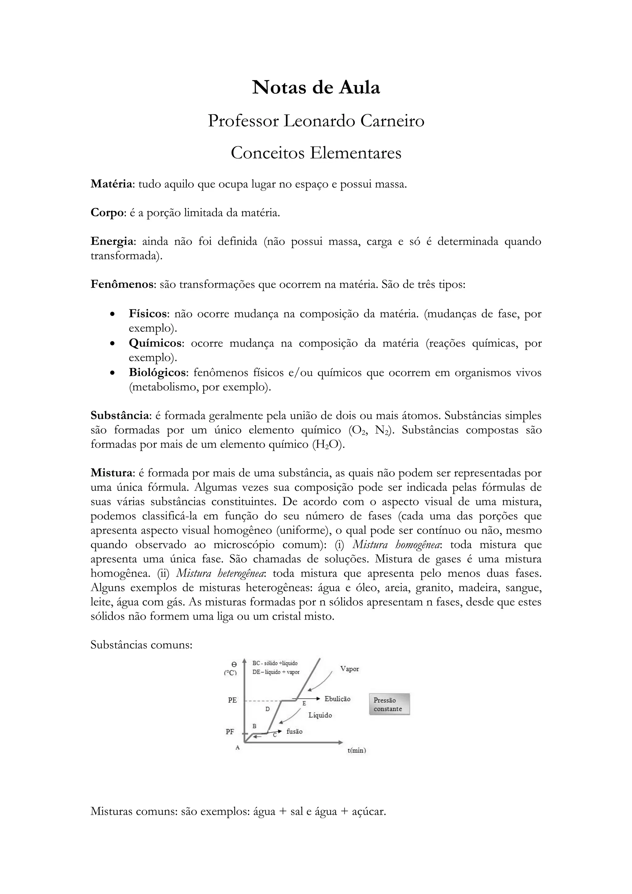 O documento define conceitos elementares de matéria, corpo, energia, fenômenos, substâncias, misturas, densidade. É explicado que matéria ocupa espaço e tem massa, corpo é uma porção limitada de matéria, e energia ainda não foi definida mas só é determinada quando transformada. Fenômenos são transformações na matéria, classificadas em físicos, químicos e biológicos. Substâncias são formadas por átomos e misturas por mais de uma substância.