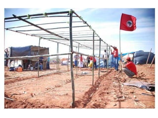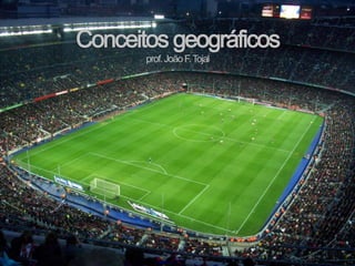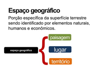 O documento discute conceitos geográficos como paisagem, lugar e território. Define paisagem como a porção da superfície terrestre identificada por elementos naturais, humanos e econômicos. Apresenta tipos de paisagens naturais e como estas podem ser modificadas pela ação humana. Explica que lugar é onde as pessoas realizam atividades cotidianas e estabelecem relações, enquanto território é a base física sobre a qual um Estado exerce soberania dentro de fronteiras políticas.