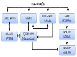 1) O documento discute conceitos geográficos como território, paisagem natural e cultural, espaço geográfico e espaço natural.