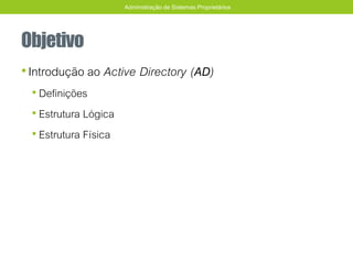 O documento introduz o Active Directory, definindo-o como um serviço de diretório para gerenciar recursos de rede de modo eficiente. Descreve sua estrutura lógica e física, explicando que a lógica organiza os objetos hierarquicamente e a física otimiza o tráfego de rede. Também apresenta conceitos como domínios, objetos, classes de objetos e protocolo LDAP.