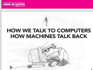 O documento discute a evolução da interatividade ao longo do tempo, desde os primeiros computadores até as tecnologias atuais como realidade aumentada e toque. A interatividade foi se expandindo de computadores para diversas mídias e objetos do cotidiano, permitindo novas formas de engajamento do usuário.