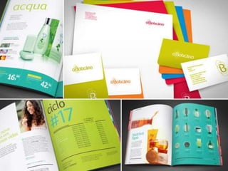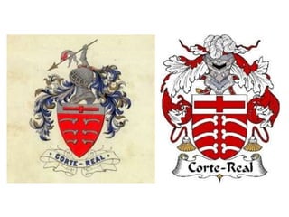 O documento descreve a história do brasão da família Corte-Real, com uma descrição heráldica do brasão. Também discute identidade visual e logotipos, mencionando exemplos como o monograma da marca O Boticário, inspirado na caligrafia grega, e sua tipografia exclusiva de formas arredondadas.