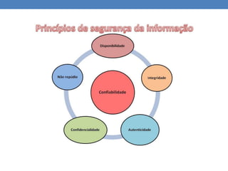 O documento discute conceitos de segurança da informação, como segurança, ativos da informação, princípios de segurança, ameaças e medidas de proteção. Ele define termos como TI, hardware, software, usuários, incidentes, privacidade e vulnerabilidades. Também aborda espécies de malware como vírus, worms e trojans.