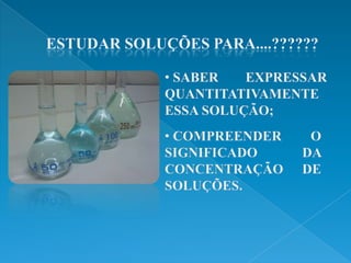 O documento discute soluções químicas, definindo-as como misturas homogêneas de dois ou mais componentes. Explica que o soluto é o componente em menor quantidade e o solvente é o componente que dissolve o soluto. Também classifica diferentes tipos de soluções e discute como a concentração de uma solução depende da quantidade relativa de soluto e solvente.