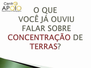 O documento analisa a concentração de terras no Brasil, destacando a desigualdade histórica na distribuição de terras que favoreceu grandes proprietários em detrimento de trabalhadores rurais. Com base em dados de 2007, demonstra que a maioria das pequenas propriedades é responsável por uma fração mínima da área agrícola total, enquanto grandes propriedades dominam a maioria da terra cultivável. O texto também menciona práticas como grilagem e exploração da mão-de-obra, que perpetuam as condições adversas no campo.