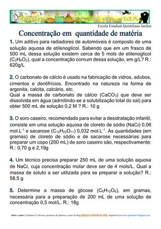 Este documento apresenta 5 problemas de concentração de soluções químicas. Os problemas envolvem calcular a massa de solutos necessários para preparar soluções aquosas de determinada concentração e volume, como etilenoglicol, carbonato de cálcio, cloreto de sódio, sacarose e glicose.