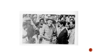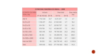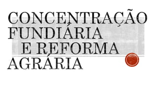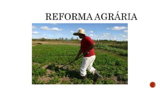 A reforma agrária brasileira começou com as capitanias hereditárias e sesmarias no século 16, e mais tarde a lei de terras de 1850. O documento descreve a desapropriação de latifúndios improdutivos e o assentamento de famílias com auxílio financeiro e técnico para promover uma agricultura mais produtiva.