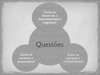 Jean Piaget foi um psicólogo suíço que estudou o desenvolvimento cognitivo infantil. Ele propôs que as crianças passam por estágios de desenvolvimento, cada um com modos de pensamento característicos, indo do sensório-motor ao formal. Sua teoria da aprendizagem por assimilação e acomodação explica como as estruturas mentais se desenvolvem ao longo do tempo.