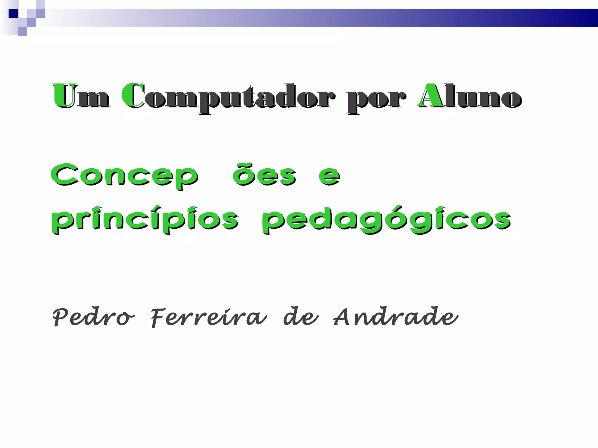 O documento discute concepções pedagógicas para um programa "Um Computador por Aluno" no Brasil. Ele descreve o conhecimento como uma teia de relações em constante evolução e defende uma educação flexível organizada em redes. Também apresenta princípios pedagógicos como aprendizagem baseada em projetos, formação de comunidades de aprendizagem e integração de diferentes linguagens.